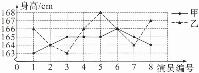 2. (凉山州中考)在一次芭蕾舞比赛中,甲、乙两个芭蕾舞团都表演了舞剧《天鹅湖》,每个团参加表演的 8 位女演员身高的折线统计图如下。则甲、乙两团女演员身高的方差 $ s^{2}_{甲} $、$ s^{2}_{乙} $ 大小关系正确的是(