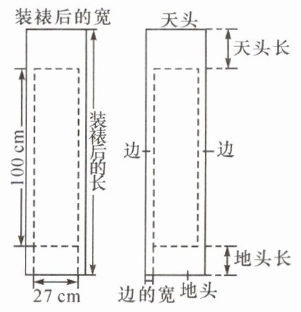 4. (2024·厦门湖滨中学期末)对联是中华传统文化的瑰宝,对联装裱后,如图所示,上、下空白处分别称为天头和地头,左、右空白处统称为边.一般情况下,天头长与地头长的比是6:4,左、右边的宽相等,均为天头长与地头长的和的$\frac{1}{10}.$某人要装裱一副对联,对联的长为100cm,宽为27cm.若要求装裱后的长是装裱后的宽的4倍,求边的宽和天头长.