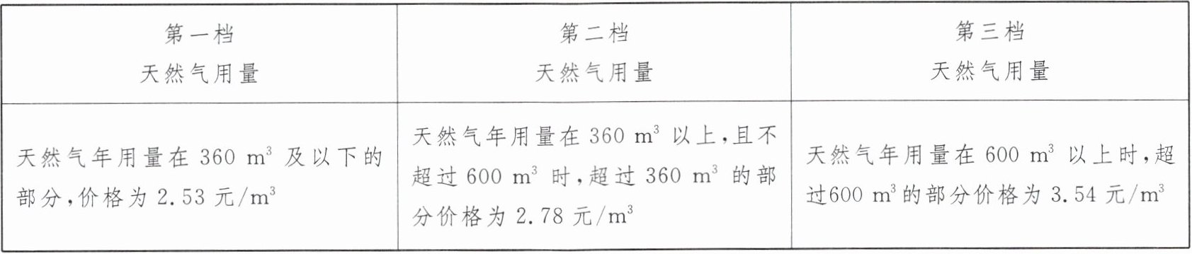 (1)500m³天然气处于第二档天然气用量,需缴纳天然气费:360×2.53+(500-360)×2.78=1300(元).