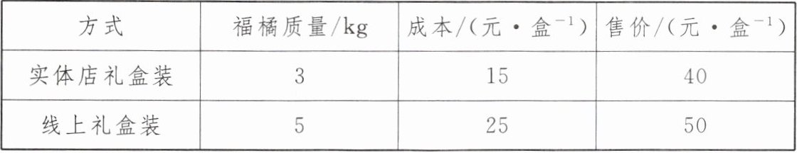 (1)销售商第一批购进 $ 1000 $ kg 福橘全部售卖完毕,已知实体店比线上少卖 $ 40 $ 盒,则实体店和线上各售出多少盒?