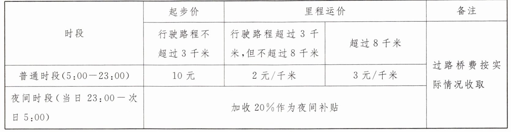 (1)王刚 9:00 乘坐出租车由家去往 A 景区,到达后他向出租车司机支付了 57 元(其中包含 10 元过路桥费,等候费忽略不计),则他家到 A 景区的路程是