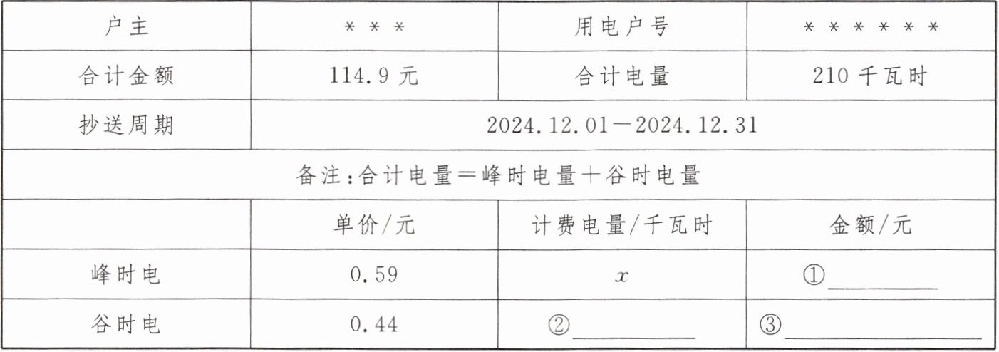 (2)求该账单中的峰时电量、谷时电量分别为多少千瓦时。(请利用方程解决问题)
