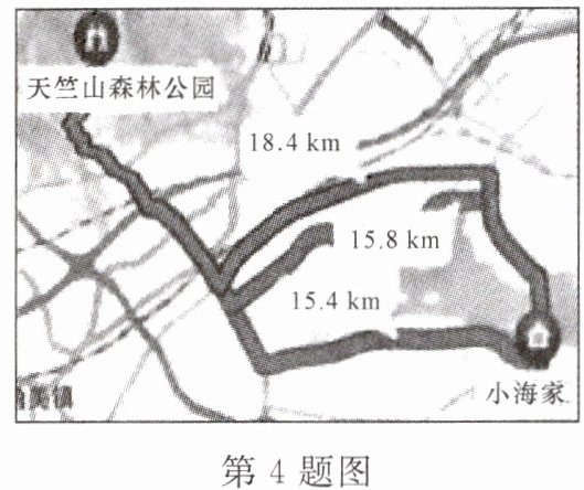 4. 小海同学计划到距家直线距离为 $12.9$ 千米的天竺山森林公园游玩。他通过导航软件发现有三条可选路线,如图所示,长度分别为 $15.8$ 千米,$15.4$ 千米,$18.4$ 千米。能解释这一现象的数学知识是