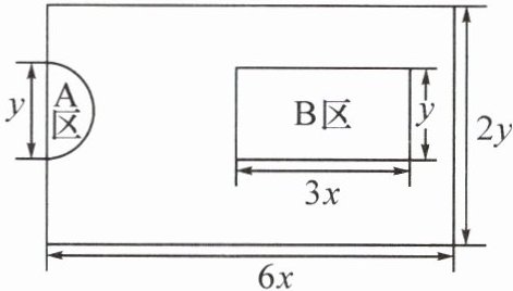 15. 如图,一个长方形游乐场的长为$6x$m,宽为$2y$m,其中半圆形A区为休息区、长方形B区为游泳区,其他区域是绿化草地.已知半圆形A区的直径和长方形B区的宽都是$y$m,B区的长是$3x$m.
