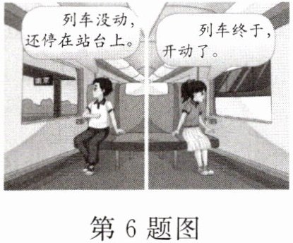 6. 如图所示,小明和小华坐在同一列火车中,突然小华觉得自己坐的列车开动了,而旁边的小明却认为列车没动,小华是以