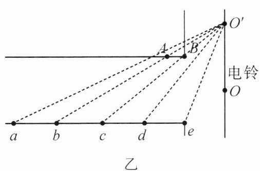 12. (2023·武汉)一块仪容镜如图甲所示,放在某学校走廊的AB处,仪容镜靠墙而立,镜面与墙壁平行,在另一面墙壁上的O处悬挂一个电铃,如图乙所示。小强同学沿着走廊的ae直线走动,若将人和电铃各自看作一个点,为了总能看到电铃通过仪容镜所成的像O',则小强同学所在的区间是(