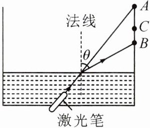 11. (2023·泉州晋江市期末)如图所示,将透明方形水槽水平放置,固定在水槽底部的激光笔沿图示方向发出一道细光束,只通过缓慢改变水槽中的水量来探究光的折射现象。水槽中未注水时可在侧壁上A处得到一个光点,注入一定量的水后,光点移至B处,为使B处的光点移至C处,则应使水槽中的水量