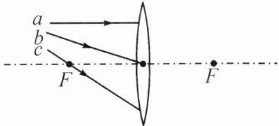 12. (1)(2024·内江)如图,F是凸透镜的焦点,a、b、c是三条入射光线,请画出这三条光线经凸透镜后的出射光线。