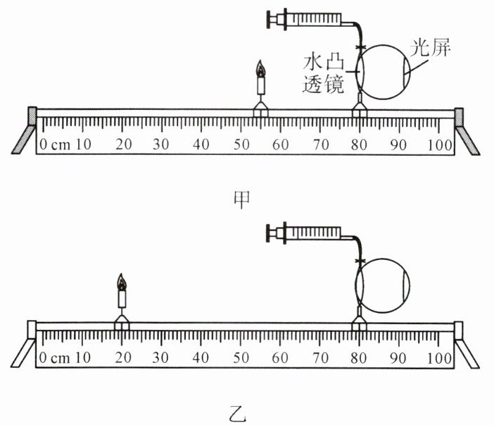 13. (2023·莆田期末)为了探究人眼成像原理,物理兴趣小组用“水凸透镜”和球形透明的塑料球自制了一个简易眼睛模型,通过注水或抽水改变水凸透镜的厚度,来模拟眼睛中晶状体的变化,光屏相当于视网膜,将蜡烛和模型放在光具座上,实验装置如图甲。