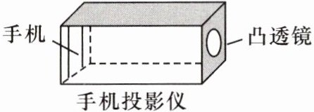 5. (2024·聊城)在学习了凸透镜成像规律后,小慧同学计划制作一个“手机投影仪”。现有器材如下:焦距分别为10 cm、20 cm、30 cm的凸透镜各一个,手机一部,长为30 cm的纸盒,胶带和剪刀等。“投影仪”模型如图所示,将手机和凸透镜分别固定在纸盒的两端,调整“投影仪”到墙面的距离,可在墙上看到手机画面清晰放大的像。下列说法正确的是(