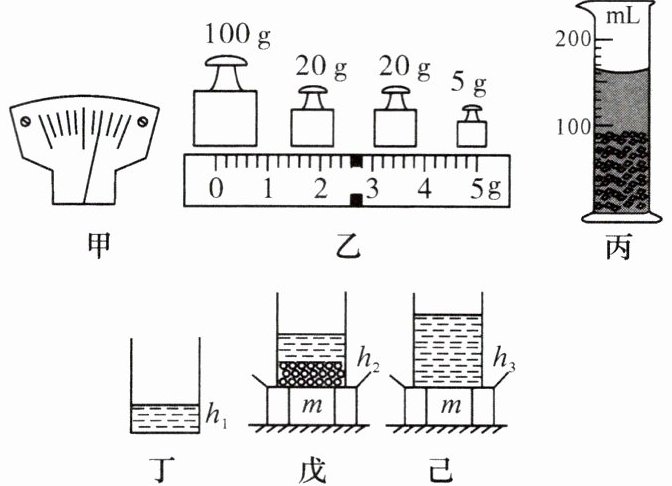 ③ 将小颗粒全部取出后往容器中缓慢注入水,直至电子秤示数重新达到 $ m $,测出此时液面高度为 $ h_{3} $,如图己所示;