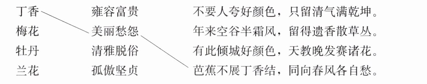 丁香 雍容富贵 不要人夸好颜色,只留清气满乾坤梅花 美丽愁怨 年来空谷半霜风,留得遗香散草丛。牡丹 清雅脱俗 有此倾城好颜色,天教晚发赛诸花。兰花 孤傲坚贞 芭蕉不展丁香结,同向春风各自愁。