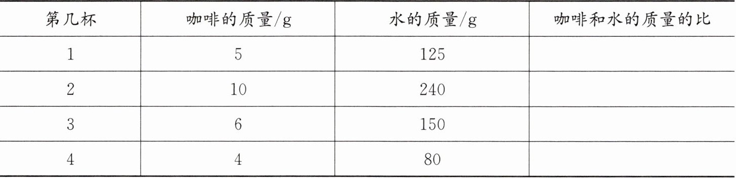 3. 写出每杯咖啡中咖啡和水的质量的比,并化简。