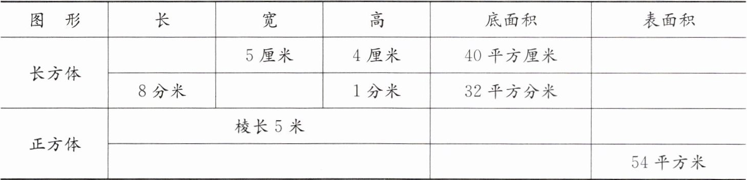 |长方体|8分米|4分米|1分米|32平方分米|88平方分米|