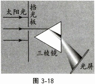 4. 如图 3 - 18 所示,太阳光通过三棱镜后,在光屏上会形成一条彩色光带,这种现象叫____,产生这一现象的原因是白光中包含的不同颜色的光通过三棱镜发生____(选填“反射”或“折射”)时的偏折程度____(选填“相同”或“不同”)。