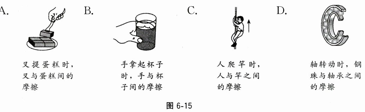 4. 日常生活中,摩擦有利也有弊。如图 6 - 15 所示的情景中属于有害摩擦,并需要减小的是( )。