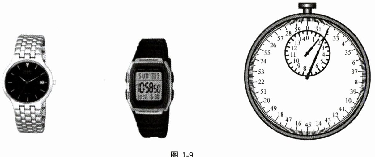 7. 如图 1 - 9 所示,机械手表的时间为____,电子手表的时间为____,秒表的时间为____。