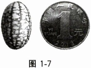 1. 小明同学到某地游学,见到一种外表酷似微型西瓜的水果,其独特的迷你造型和清爽的口感令人称奇。图 1 - 7 是迷你“西瓜”与 1 元硬币放在一起的对比照,根据图片信息,估测该迷你“西瓜”的长度约为( )。