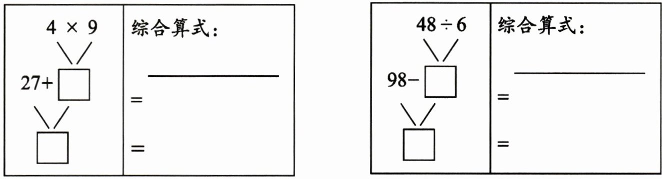36;63;$27+4×9$;27+36;63;8;90;$98-48÷6$;98-8;90;乘除;加减