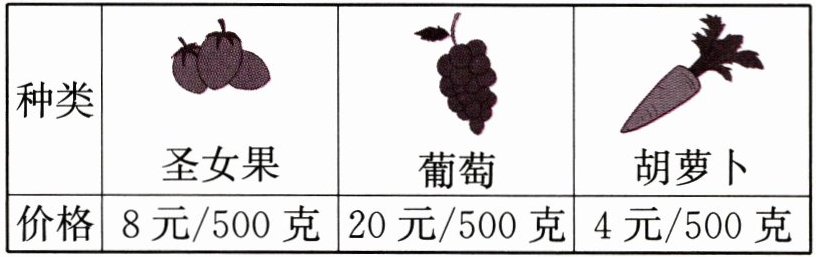 $2000÷500 = 4$,$2$千克圣女果的价格为$4×8$元;葡萄$500$克价格为$20$元。