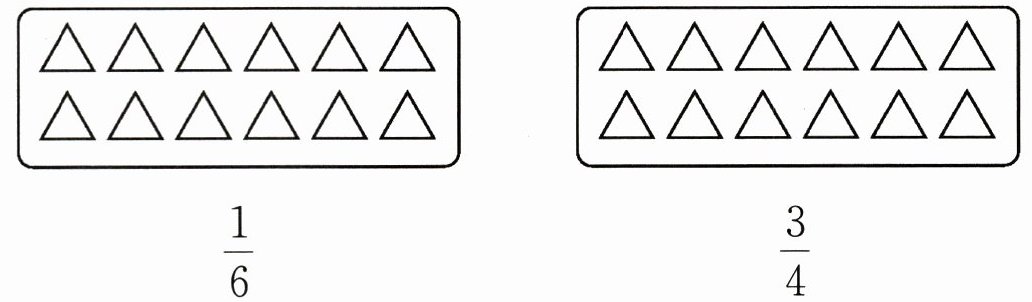 1. 下图各有 12 个△,分一分,涂一涂,分别找到它的$\frac{1}{6}和\frac{3}{4}$,列式比一比涂色个数是否相同?