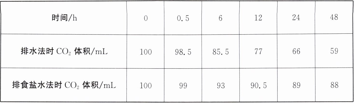 |排水法时$CO_2$体积/mL|100|98.5|85.5|77|66|59|