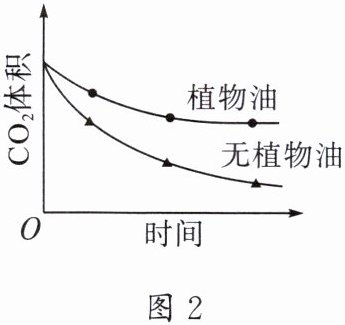 (2)小方设计并完成以下对照实验:用两个量筒分别收集$100mLCO_2,$将它们倒置于水槽中,向其中一个量筒内注入少量植物油,使$CO_2$与水被植物油隔开$(CO_2$与植物油不反应),测得量筒内$CO_2$体积随时间变化曲线(如图2)。分析该图可得出的结论是_________。