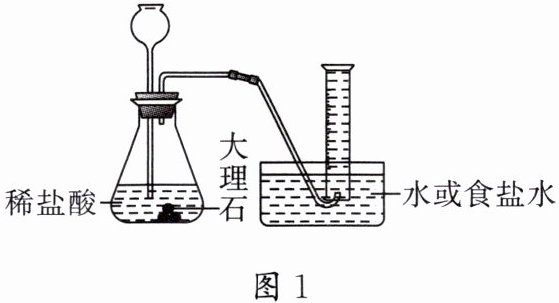 相同条件下,该小组分别用排水法、排食盐水法收集$CO_2($如图1),待收集$100mLCO_2$后,移出导管,每隔一段时间观察并记录量筒内$CO_2$的体积。重复实验,所测数据平均值如下表: