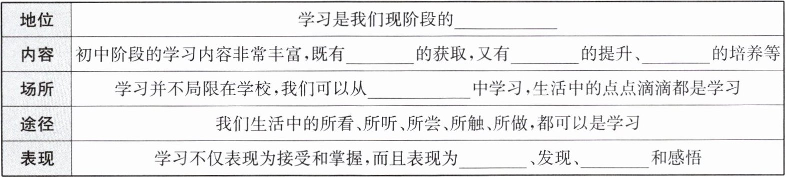 习内容非常丰富,既有______的获取,又有______的提升、______的培养等||场所|学习并不局限在学校,我们可以从______中学习,生活中的点点滴滴都是学习|