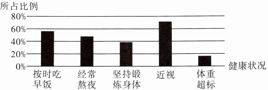 (1)①调查结果表明,许多同学有不良生活习惯,如不按时吃早餐、经常熬夜、不坚持锻炼身体,有的甚至已造成了不良后果,如眼睛近视、体重超标。②说明同学们健康意识普遍淡薄,这是对生命不负责任的表现。增强爱护身体的意识、养成健康生活习惯,迫在眉睫。