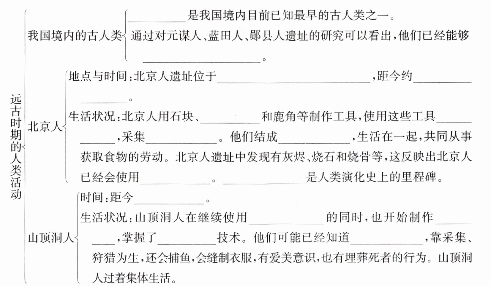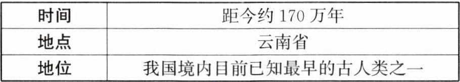 元谋人 制作和使用工具 北京周口店龙骨山上 70万—20万年 兽骨 猎取动物 植物果实 群体 火 学会用火