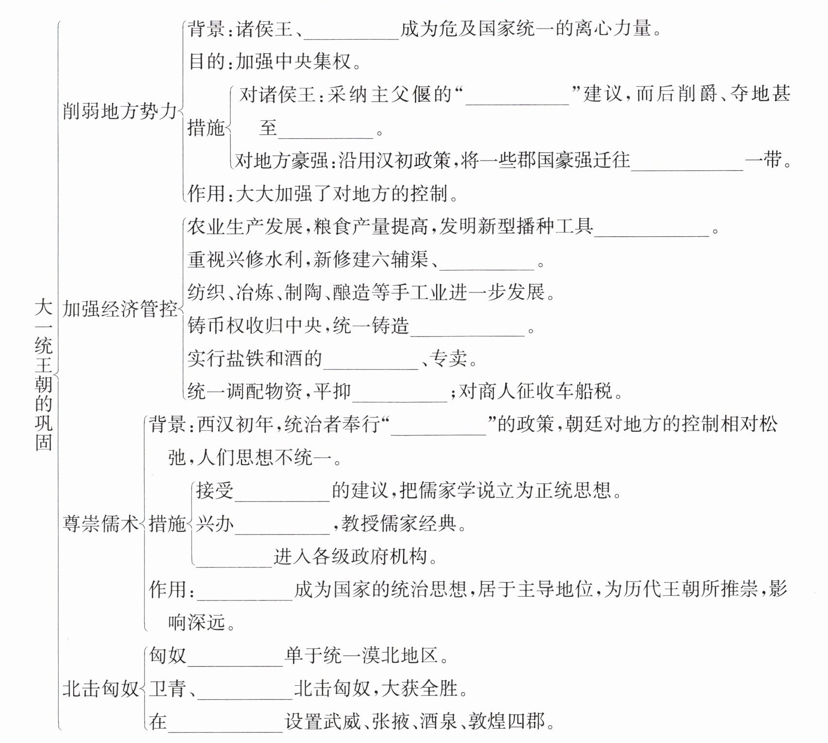 地方豪强;推恩令;除国;关中;耧车;白渠;五铢钱;官营;物价;无为而治;董仲舒;太学;儒家学说;冒顿;霍去病;河西走廊