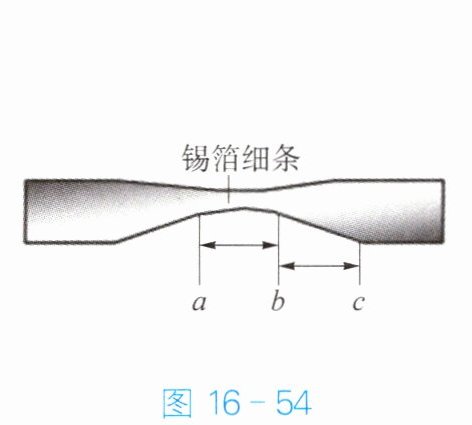 13. 如图 16 - 54 所示,将锡箔纸剪成中间较窄的细条,然后将其两端分别连接电池的正、负极,发现细条中较窄处 ab 段很快开始冒烟起火,这是因为细条将电池短路了。若 ab 段的长度等于 bc 段的长度,则 ab 段的电阻