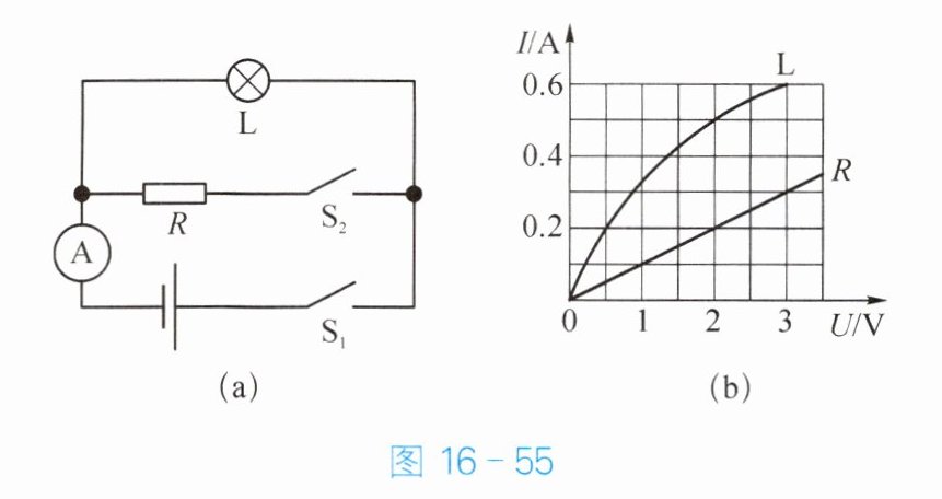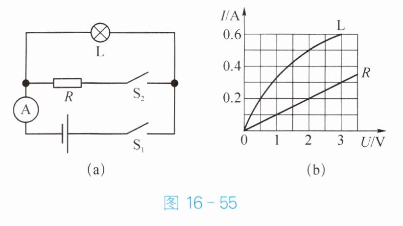 14. 小灯泡 L 的电阻为 5 Ω,将小灯泡 L 和电阻 R 接入如图 16 - 55(a)所示的电路,且电源电压不变。只闭合开关 $ S_1 $,图 16 - 55(b)是小灯泡 L 和电阻 R 的电流与电压的关系图像,则电源电压为