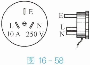 (1) 如图 16 - 58 所示,他发现自己家洗衣机用的是三脚插头,其铭牌上标有“10 A 250 V”字样。其中的“10 A”表示什么含义?