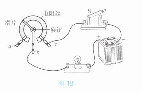 15. 图 16 - 56 是某同学设计的模拟可调光台灯的电路,其中电位器有 a、b、c 三个接线柱。请连接电路,使滑片顺时针旋转时灯泡变亮。