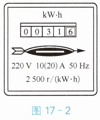 - 在家庭电路中,只让一个用电器正常工作 $ 1h $,能使图 17 - 2 中电能表的表盘转 $ 1250r $。该用电器正常工作 $ 1h $ 所消耗的电能为