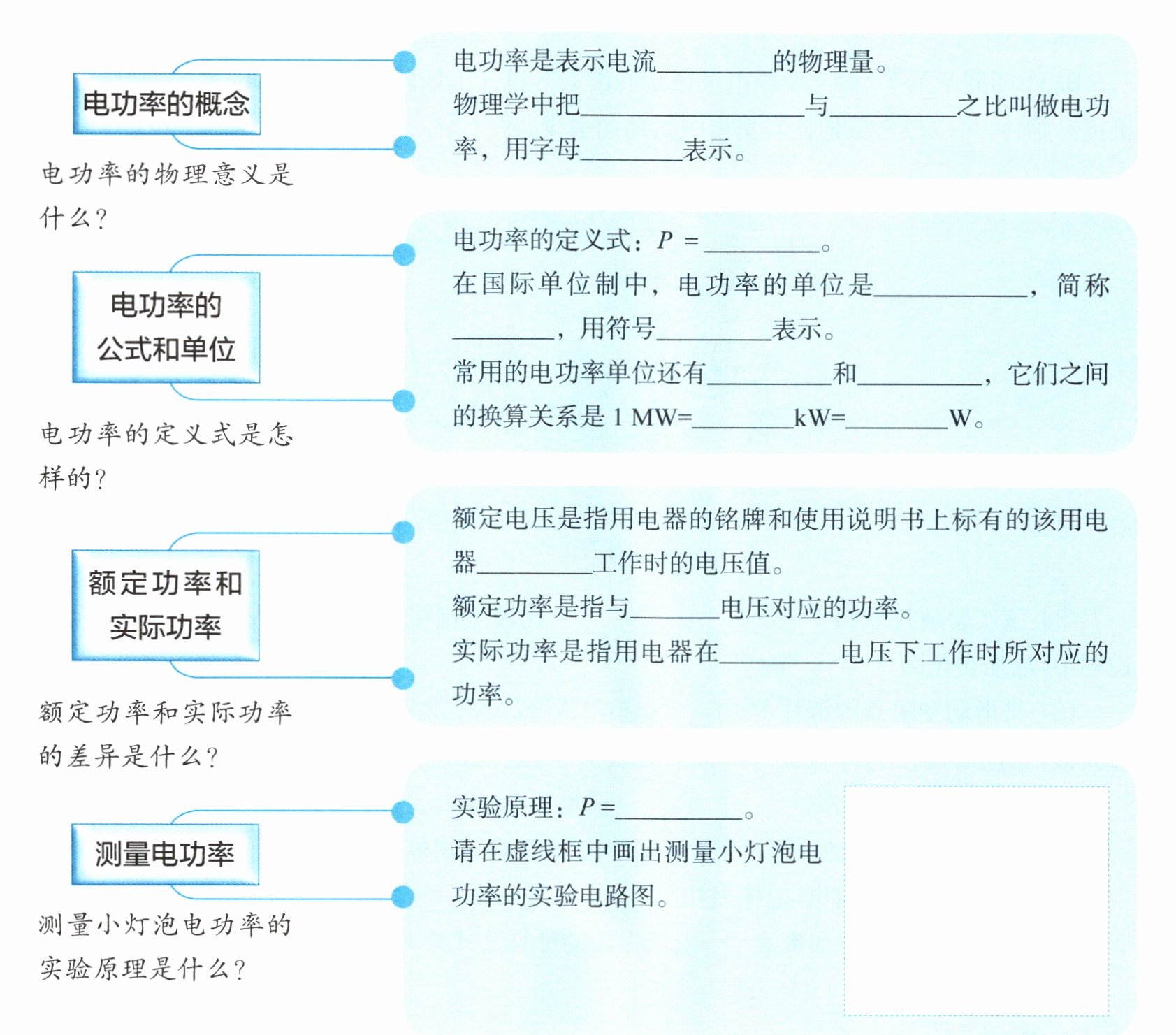 |测量小灯泡电功率的实验原理是什么?|实验原理:$P= $ \underline{\quad\quad}。请在虚线框中画出测量小灯泡电功率的实验电路图。|