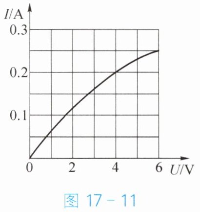 3. 标有“$6V\ 1.5W$”的小灯泡,其电流随两端电压变化的情况如图$17 - 11$所示。若把这样的两个小灯泡串联接在$8V$的电源两端,则每个小灯泡的电阻及实际功率约为(