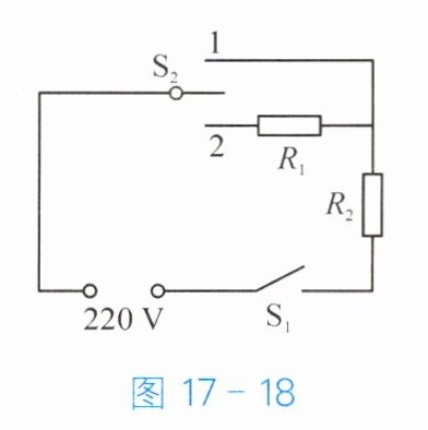8. 电水壶简化电路图如图 17 - 18 所示,其中$R_{1}和R_{2}$为发热电阻,$S_{1}$为总开关,$S_{2}$为温度开关,有 1、2 两个触点分别控制电水壶的加热和保温。下表中的数据为电水壶的部分参数。