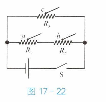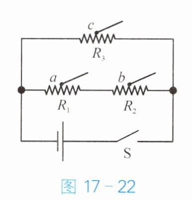 8. 小乐按照图 17-22 连接电路,其中 $ R_{1} $、$ R_{2} $、$ R_{3} $ 是三根电阻丝 ($ R_{1} < R_{2} = R_{3} $),又将三根相同的火柴 $ a $、$ b $、$ c $ 分别固定在三根电阻丝上。闭合开关后,火柴燃烧的先后顺序是(