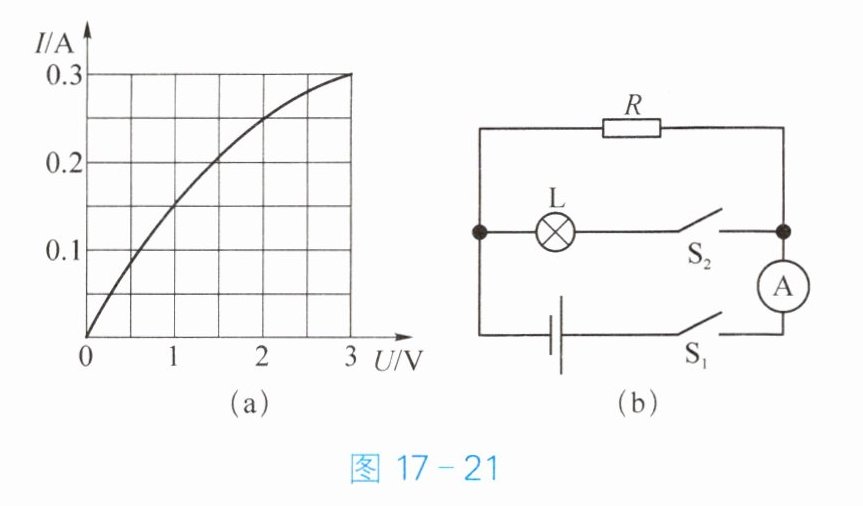 7. 小灯泡 $ L $ 的电流和电压的关系图像如图 17-21(a) 所示。将小灯泡 $ L $ 与定值电阻 $ R $ 并联,如图 17-21(b) 所示,闭合开关 $ S_{1} $,电流表的示数为 $ 0.2 \, A $;再闭合开关 $ S_{2} $,电流表的示数增加了 $ 0.25 \, A $。下列说法中正确的是(