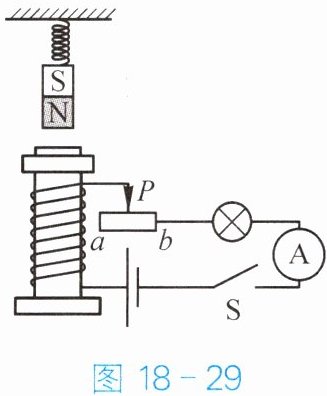 2. 如图18-29所示,电磁铁的正上方用弹簧挂着一块条形磁体。开关S闭合后,在滑片P从a端向b端移动的过程中,会出现的现象是(