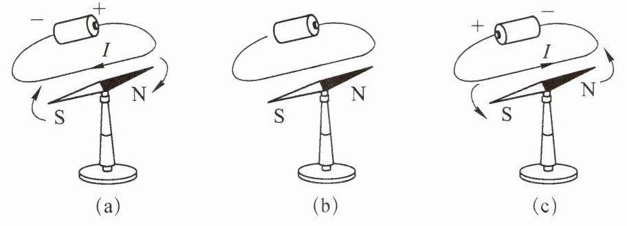 ;对比图(a)和图(c),可以发现:磁场的方向与电流