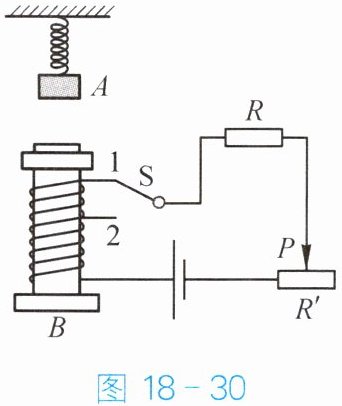 3. 如图18-30所示,A是悬挂在弹簧下的铁块,B是螺线管的铁芯,S是转换开关,P是滑动变阻器的滑片。要使弹簧的长度变长,可采取的办法是(