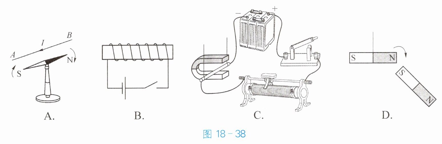 例题 为了保护环境,国家鼓励发展新能源汽车。新能源汽车的核心部件是电动机,图 18 - 38 中能说明其核心部件工作原理的是( )。