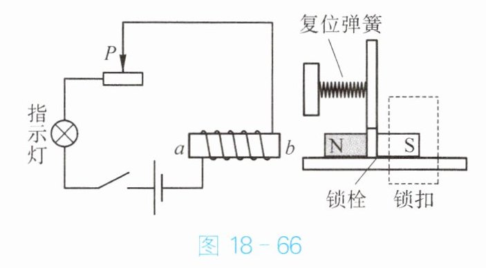 14. 图 18 - 66 是小明同学自制的简易电磁锁原理图。闭合开关,滑片 $ P $ 向左移动,使静止在水平桌面的条形磁体滑动,打开门锁。通电后,电磁铁的 $ a $ 端为