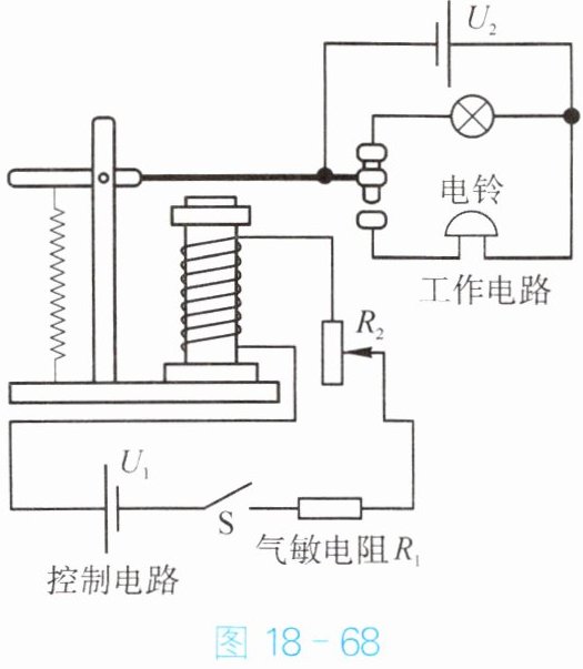 16. 图 18 - 68 是热爱课外实践的小双同学设计的汽车二氧化碳排放量检测电路。开关闭合后,电磁铁的上端是