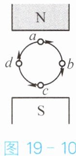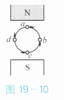 4. 如图 19 - 10 所示,闭合电路的一部分导体在两磁极间运动一周,图中小圆圈代表导体的横截面,箭头表示导体的运动方向,$ a $、$ b $、$ c $、$ d $ 是导体在磁场中的四个位置。根据产生感应电流的条件可知,导体在______