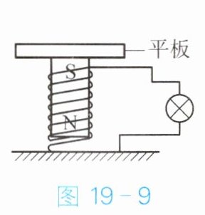 3. 某幼儿园游乐室里有一块能发电的平板,当小朋友在上面踩踏时,小灯泡便会发光。平板下方铺设的结构如图 19 - 9 所示,当来回踩踏平板时,固定在平板下方的磁体做往复运动,使固定在地面上的弹簧线圈做